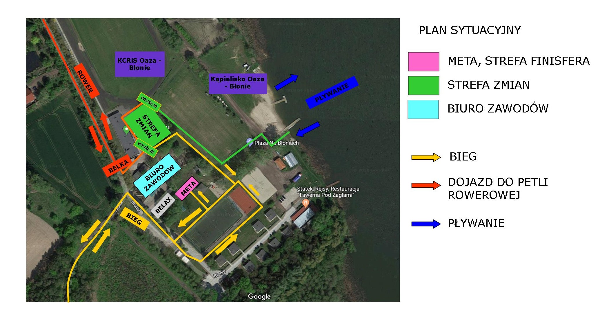 Biuro zawodów, Plaża na Błoniach i Strefa Zmian znajdują się w obrębie 100m.